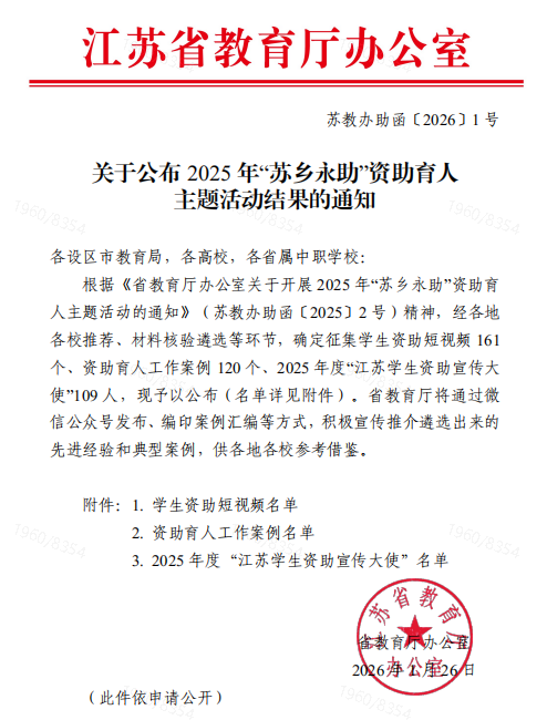 近日,省教育厅办公室印发《省教育厅办公室关于公布2025年“苏乡永助”资助育人主题活动结果的通知》,正式公布本年度“苏乡永助”系列资助育人主题活动获奖名单。我校推荐报送的1个资助育人工作案例、2个学生资助短视频、1位学生资助宣传大使均成功入围,实现报送项目100%获奖,充分彰显了学校资助育人工作的扎实成效与创新活力。