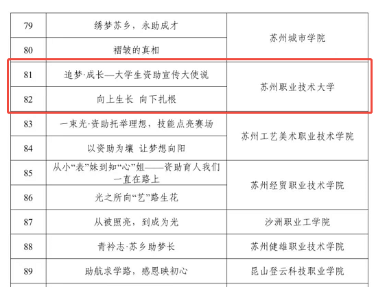 “苏乡永助”资助育人主题活动由省教育厅主办,旨在广泛宣传学生资助政策及育人成效,弘扬主旋律、传播正能量,激励广大受助学生奋发自强、立志成才、感恩回馈、为国奉献,全面促进学生德智体美劳融合发展。本次活动经过严格材料审核与多轮遴选,最终在全省范围内评选出学生资助短视频161个、资助育人工作案例120个、“江苏学生资助宣传大使”109名。