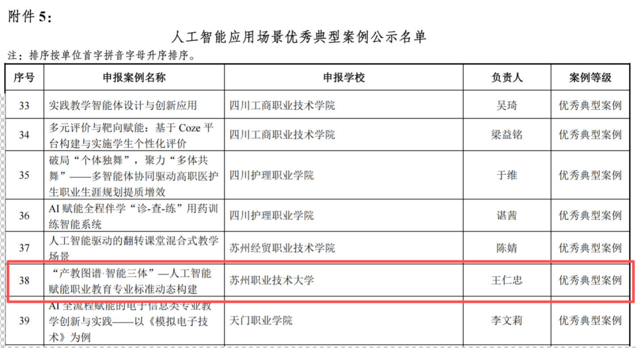 其中,《“产教图谱 智能三体”——人工智能赋能职业教育专业标准动态构建》获评人工智能应用场景优秀典型案例。该案例针对专业建设与产业需求脱节、课程体系与岗位能力适配性不足等痛点,通过搭建三大核心智能体,推动专业建设从“经验驱动”向“数据驱动”转型,为同类院校提供了可复制的实践方案。