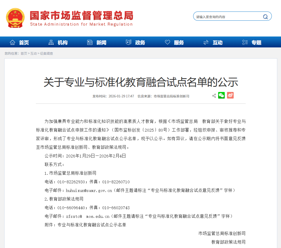 根据国家市场监督管理总局标准创新司与教育部政策法规司联合发布的《关于专业与标准化教育融合试点名单的公示》,我校成功入选全国首批专业与标准化教育融合试点单位。