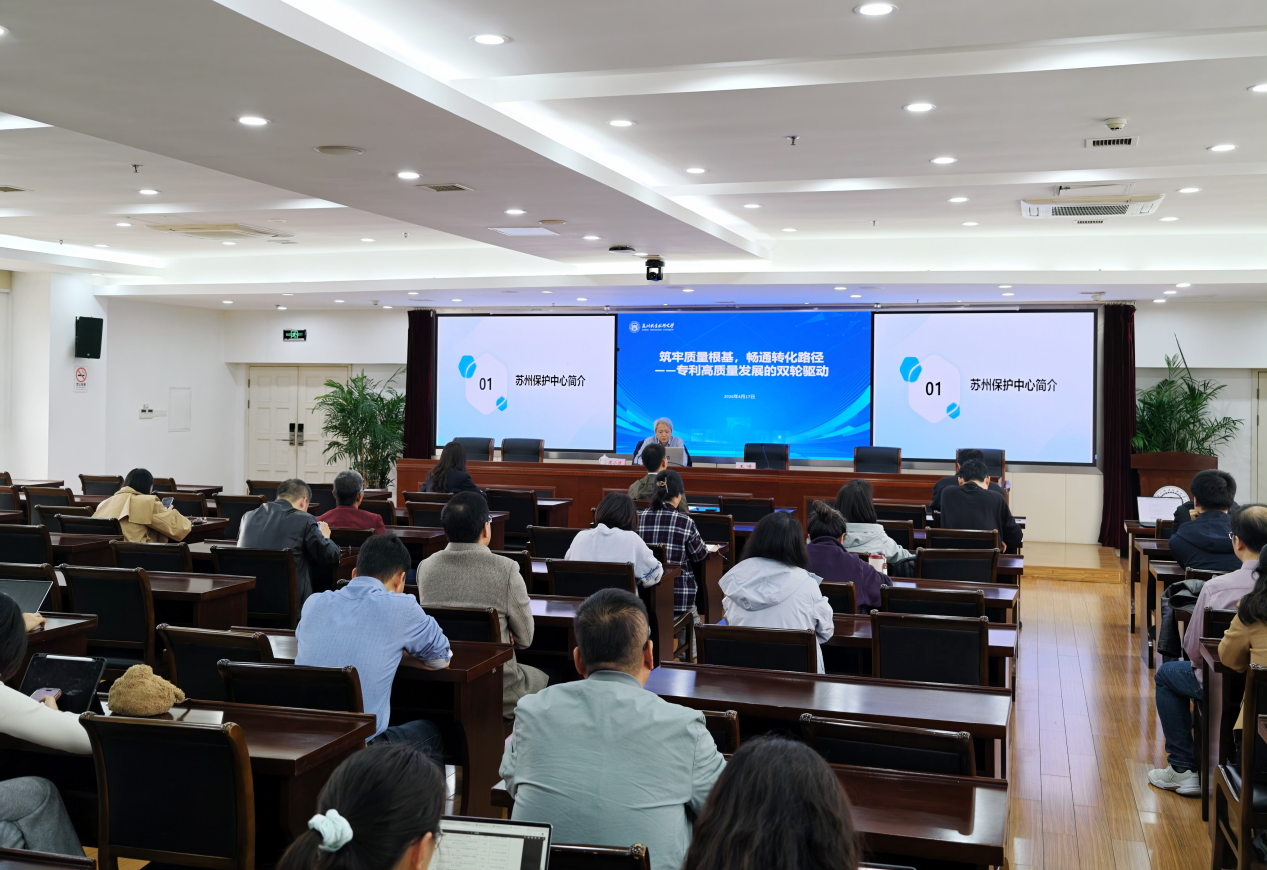 为深入贯彻落实国家知识产权强国建设战略,切实提升我校专利申请质量与科技成果转化能力,4月17日下午,我校特邀苏州市知识产权保护中心(市专利代办处)主任(处长)周小进来校作“筑牢质量根基,畅通转化路径”专题报告。校党委委员、副校长王峰主持报告会,相关院系科研骨干教师代表参加活动。